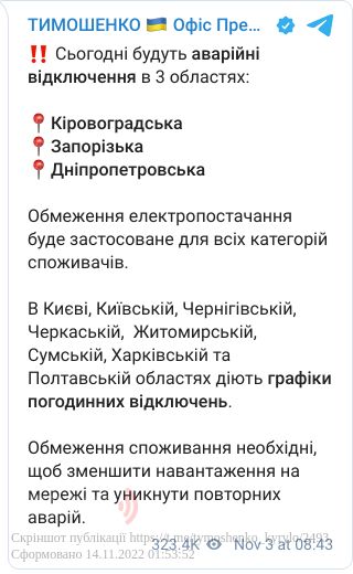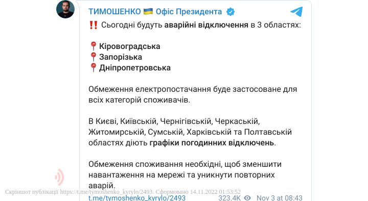 Так, світло аварійно вимикатимуть споживачам у Кіровоградській, Запорізькій та Дніпропетровській областях.