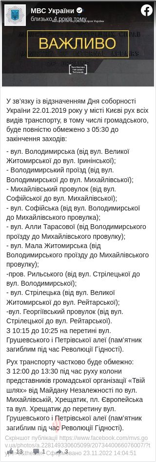 22 січня в зв'язку зі святкуванням Дня соборності в Києві обмежать рух усіх видів транспорту.