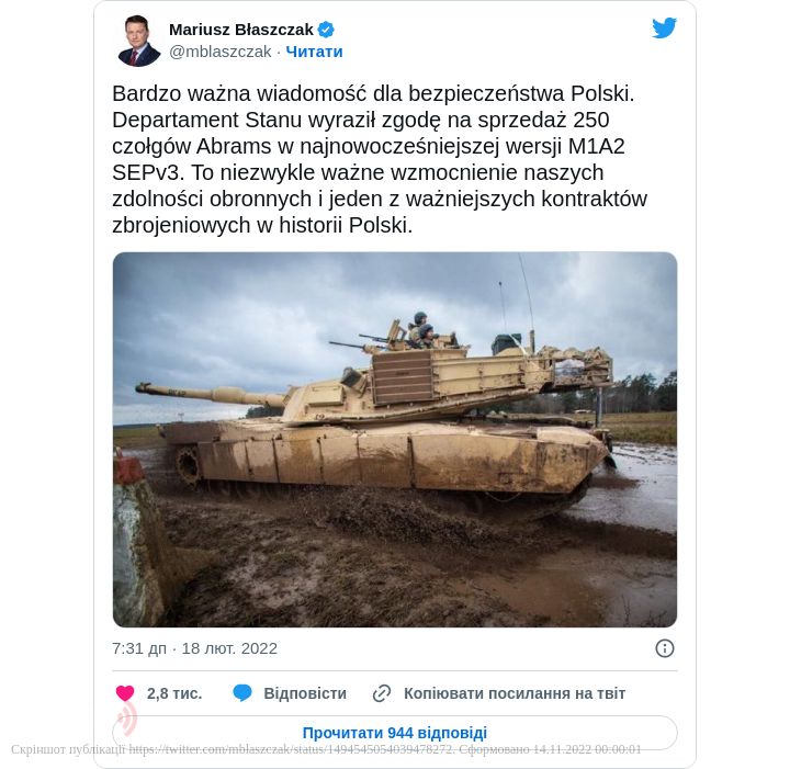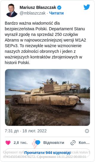 «Дуже важлива новина для безпеки Польщі. Держдепартамент висловив згоду на продаж 250 танків Abrams у найсучасніший версії M1A2 SEPv3», - написав він у своєму Twitter.
