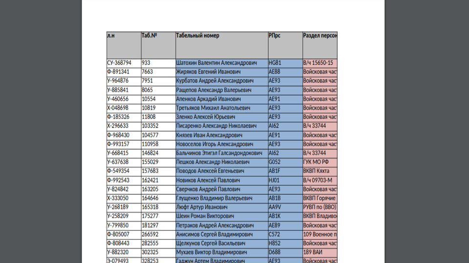 Серед даних у списку імена, табельний номер та місце служби росіян.