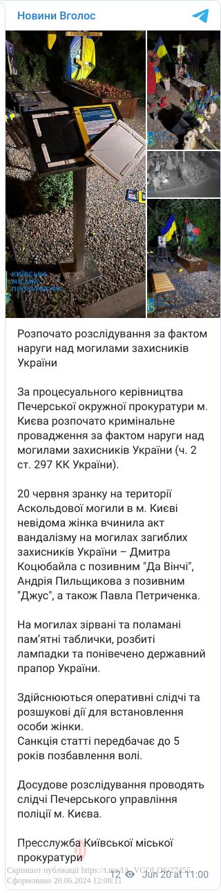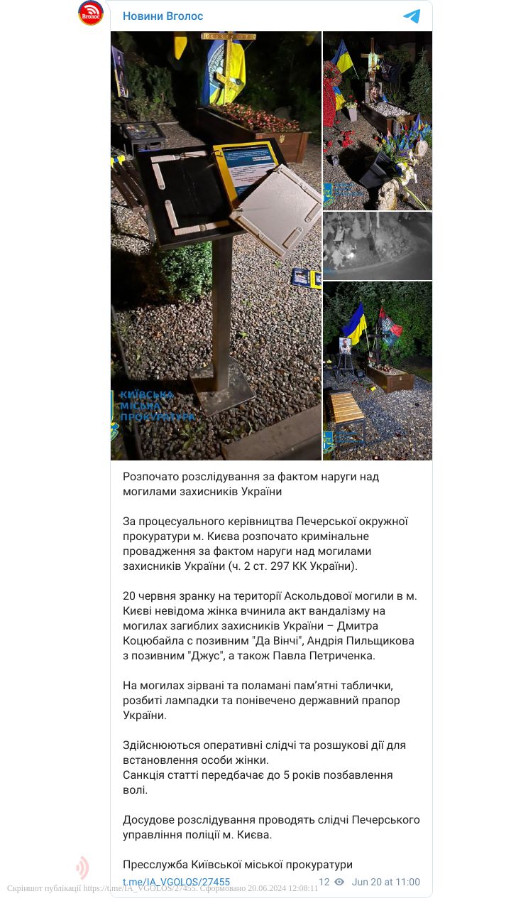 За процесуального керівництва Печерської окружної прокуратури м. Києва розпочато кримінальне провадження за фактом наруги над могилами захисників України (ч. 2 ст. 297 КК України).