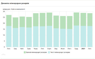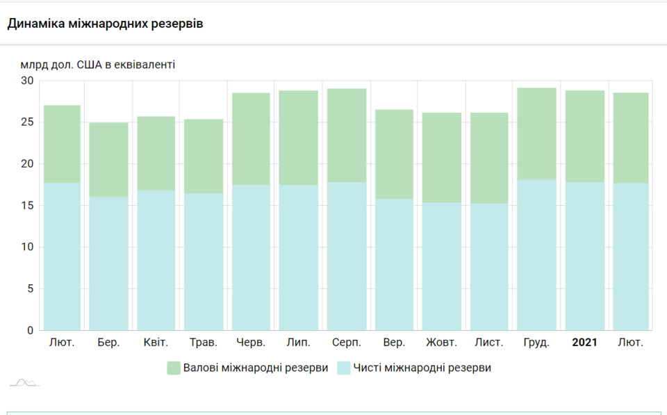 Станом на 1 березня 2021 року міжнародні резерви України в еквіваленті становили 28 543 млн дол. США. Зменшення відбулося у зв'язку з погашенням зовнішніх і внутрішніх зобов'язань держави. Вони були частково компенсовані за рахунок валютних надходжень на користь уряду та інтервенцій НБУ на валютному ринку.