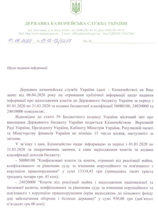 Відповідаючи на офіційний запит голови експертної організації StateWatch, керівника проєкту “Марлін” Гліба Канівського, Держказначейства повідомило, що протягом першого кварталу 2020 року (січень - березень) у корупціонерів конфіскували майже 14 тисяч гривень.