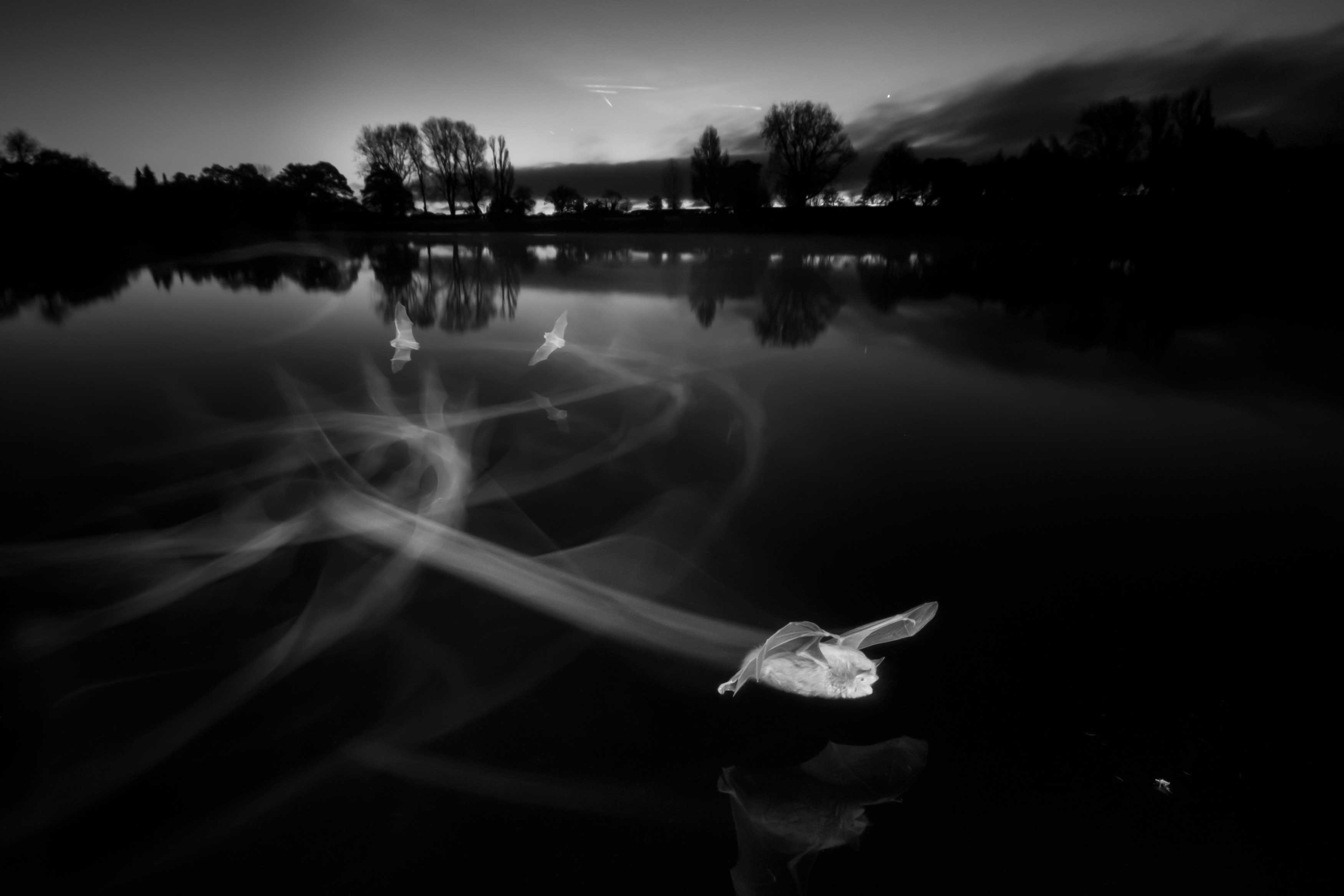 Фотокамеру з інфрачервоним об’єктивом автор світлини розробляв 14 місяців. Йому було важко створити таку камеру, яка була б здатна зняти у темряві максимально точно високошвидкісний політ кажанів. На фото з назвою "Сліди на світанку" показана мить за мілісекунди до того, як кажан проковтне комаху.