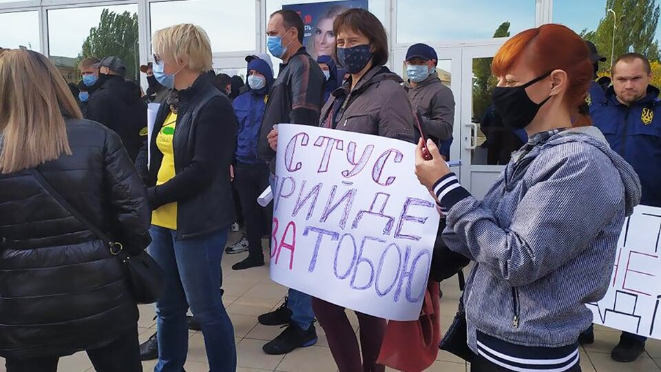 Протестувальники тримають плакати з написами «ОПЗЖ = смерть», «Стус прийде за тобою», «Миколаїв = Україна».