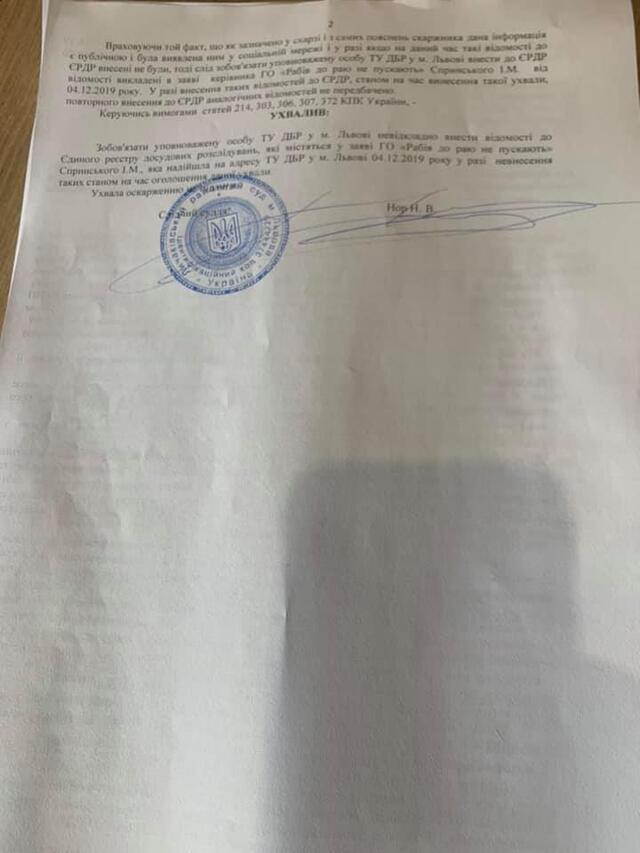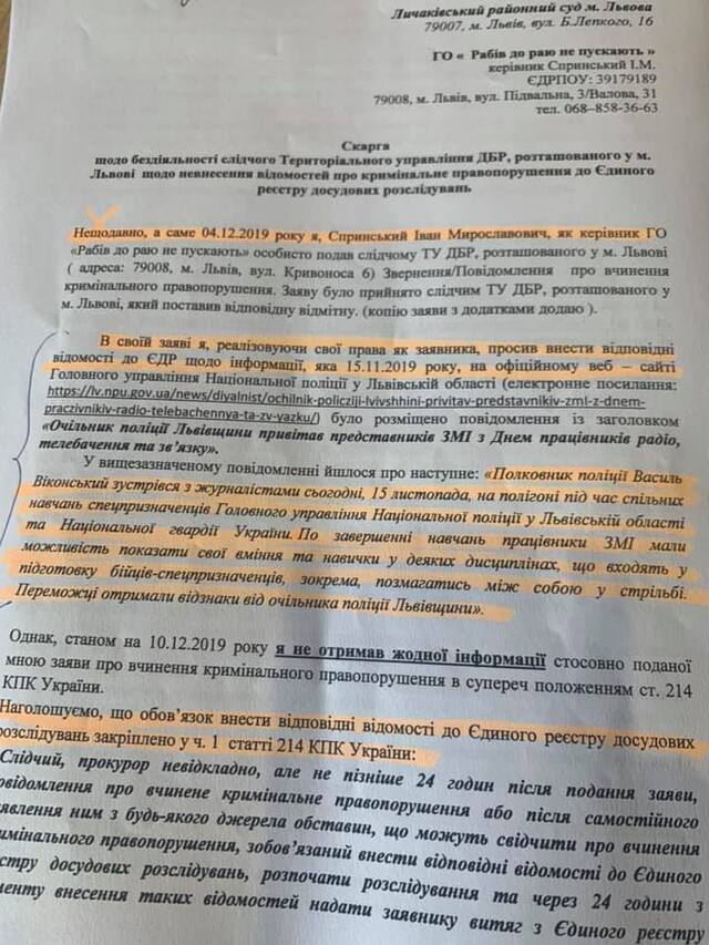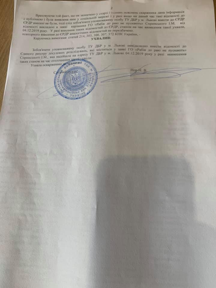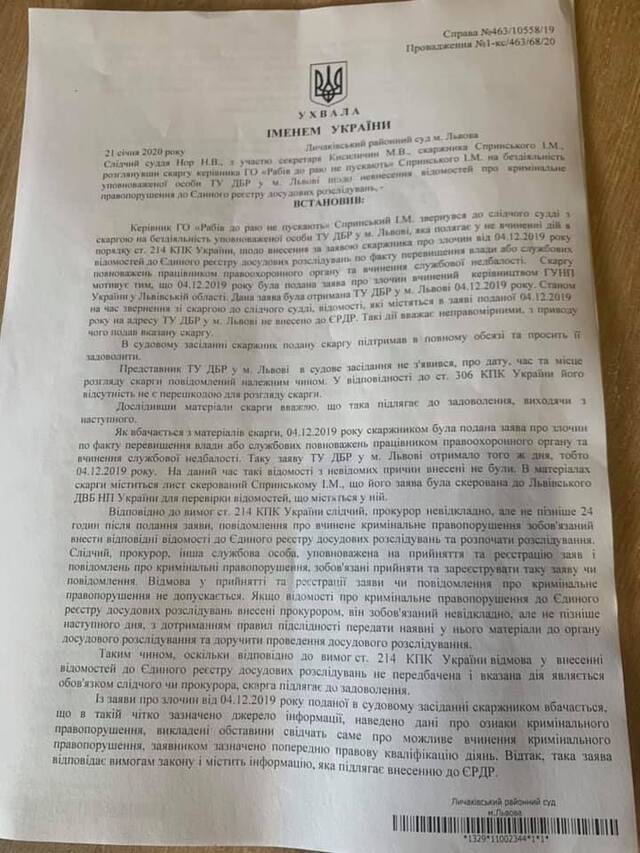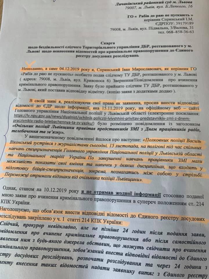 Сьогодні, Личаківський суд на підставі скарги ГО «Рабів до Раю не пускають» зобов’язав внести відомості ТУ ДБР, щодо глави Нацполіції Львівської області, ексберкутівця Василя Віконського за ст. 365 ККУ - перевищення влади або службових повноважень працівником правоохоронного органу.