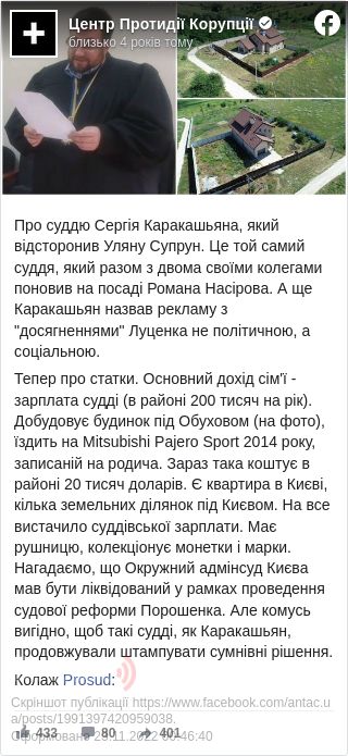 «Про суддю Сергія Каракашьяна, який відсторонив Уляну Супрун. Це той самий суддя, який разом з двома своїми колегами поновив на посаді Романа Насірова. А ще Каракашьян назвав рекламу з »досягненнями« Луценка не політичною, а соціальною», – повідомляють у «Центрі протидії корупції».