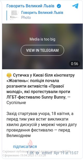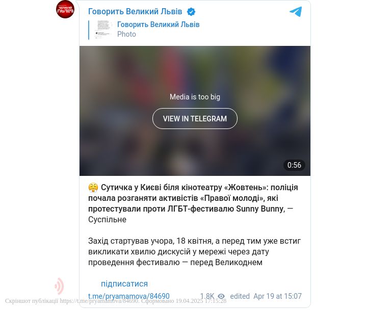 У Києві біля кінотеатру «Жовтень», де 19 квітня проходив ЛГБТК+ фестиваль квір-кіно Sunny Bunny, відбулась сутичка між радикальними активістами та поліцією.