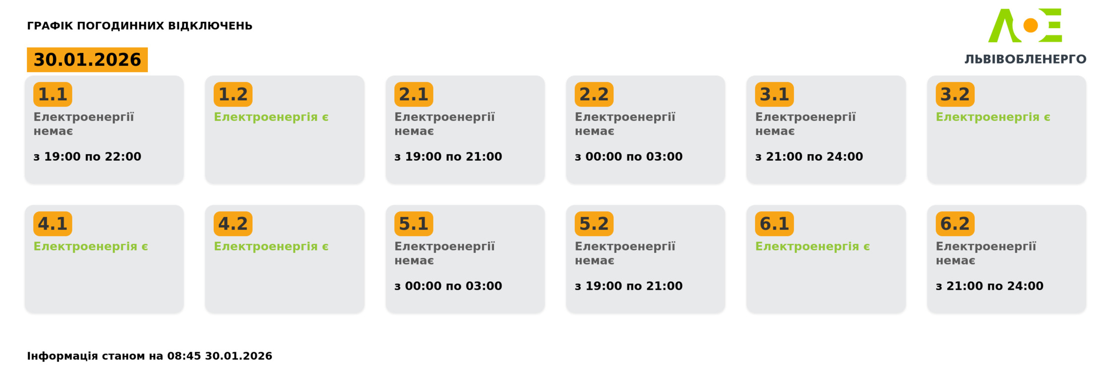 Інформація станом на 08:45 30.01.2026: