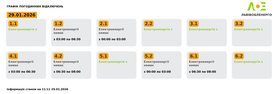 Група 1.2. Електроенергії немає з 03:00 до 06:30.