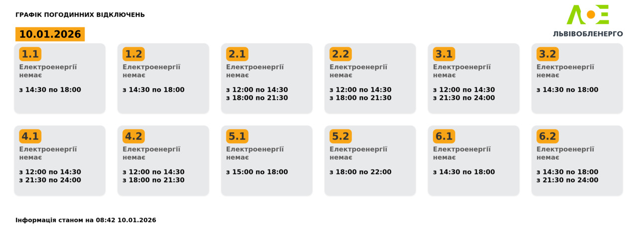 Група 4.2. Електроенергії немає з 12:00 до 14:30, з 18:00 до 21:30.