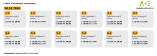 Група 2.1. Електроенергії немає з 12:00 до 14:30, з 18:00 до 21:30.