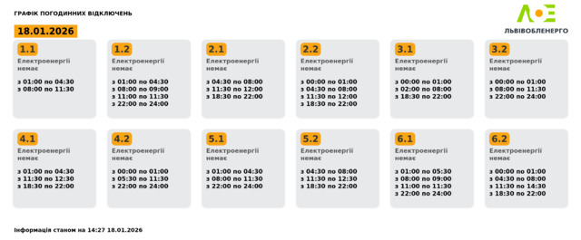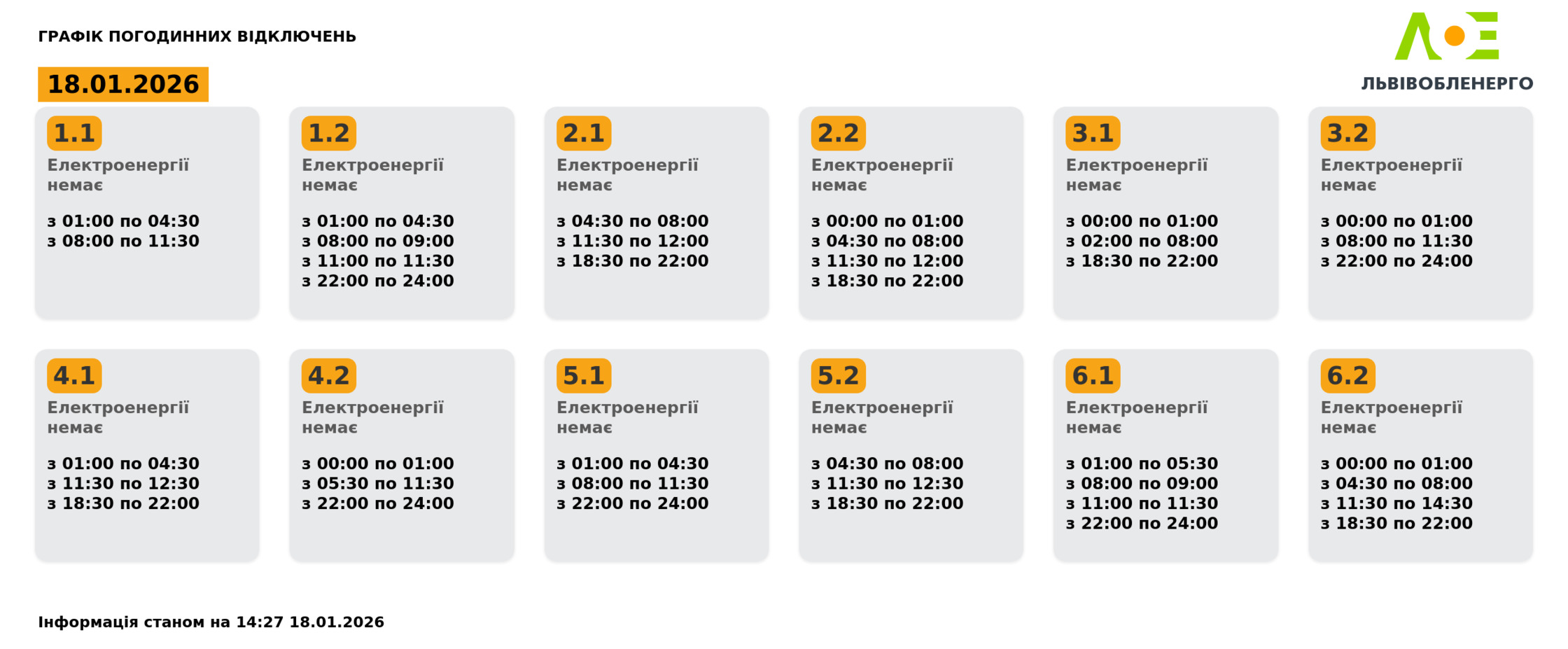 У неділю,18 січня, на Львівщині діятимуть графіки відключення світла. Електроенергію вимикатимуть усім групам. Впродовж доби графіки можуть змінюватись.