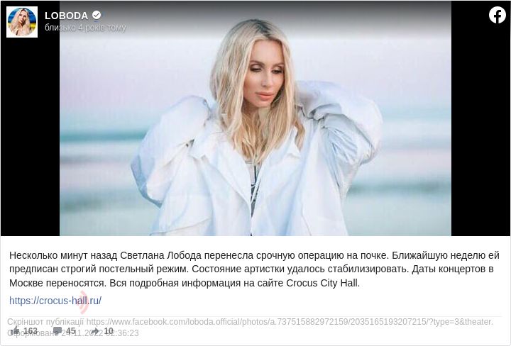 Медики підтвердили діагноз Лободи, після чого їй довелося перенести термінову операцію на нирці. За даними представників зірки, її найближчі концерти перенесені на січень 2019 року.