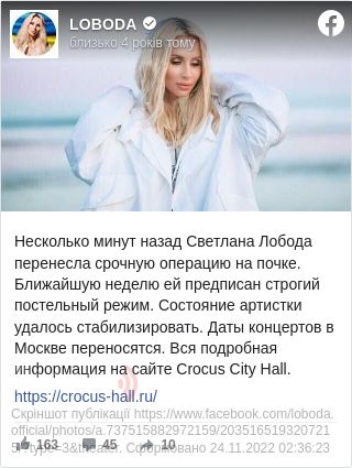 «Кілька хвилин тому Світлана Лобода перенесла термінову операцію на нирці. Найближчий тиждень їй наказаний суворий постільний режим. Стан артистки вдалося стабілізувати. Найближчі концерти переносяться», — повідомляється в Facebook.
