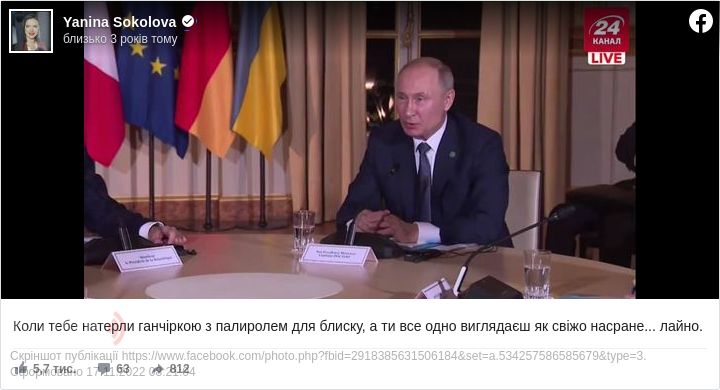 П.юопулярна українська телеведуча Яніна Соколова жорстко прокоментувала фото російського президента Володимира Путіна у межах зустрічі «нормандської четвірки».