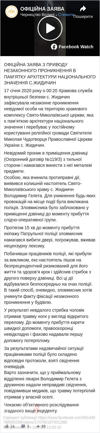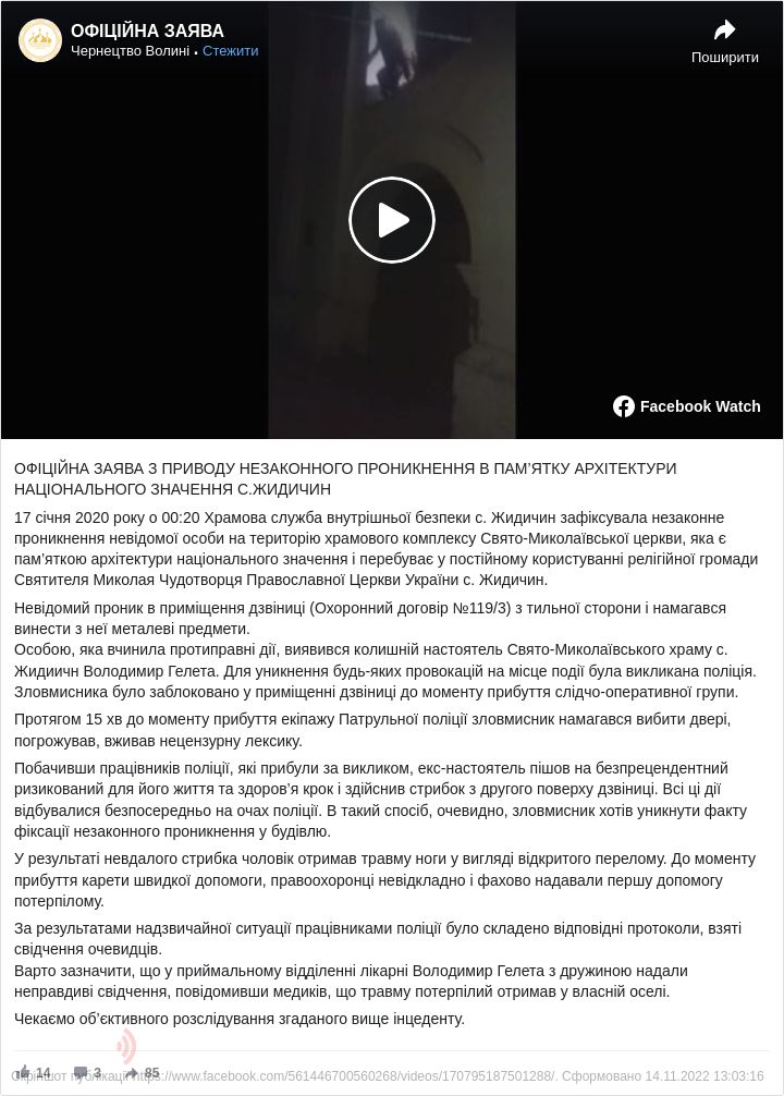 У ніч з 16 на 17 січня 2020 року храмова служба внутрішньої безпеки розташованого поряд з містом Луцьком селаЖидичин помітила невідому особу, яка проникла на територію храмового комплексу Свято-Миколаївської церкви. Чоловік забрався на дзвіницю і хотів винести звідти металеві предмети