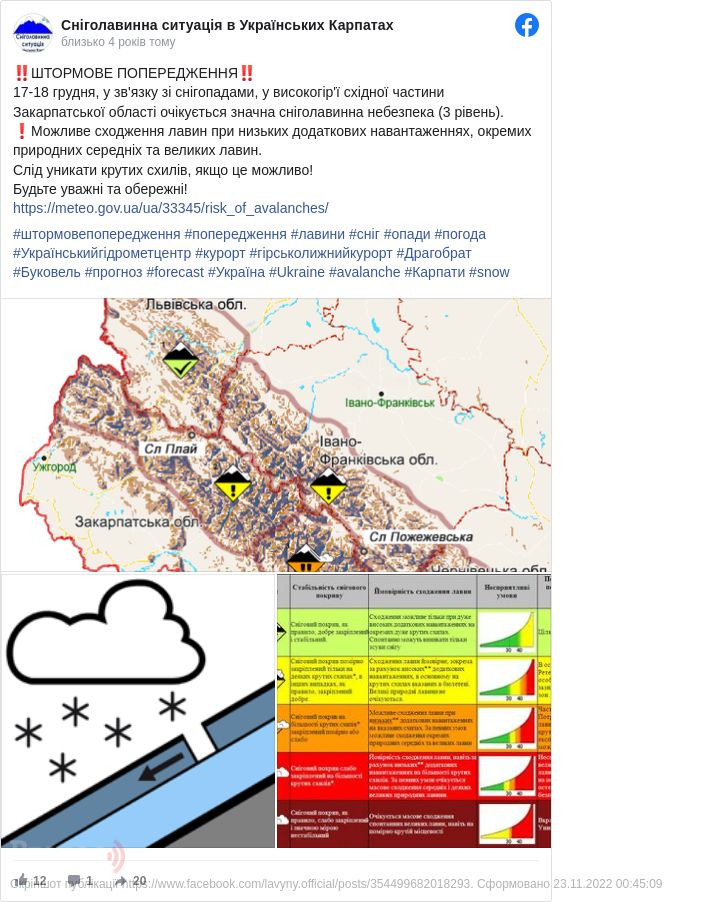 Також, як зазначається, можливе сходження очікується у високогір’ї Iвано-Франкiвської області, західної та центральної частин Закарпаття. Там очікується помірна сніголавинна небезпека (2-й рівень), а в горах Львівської області передбачається низька сніголавинна небезпека (1-й рівень).