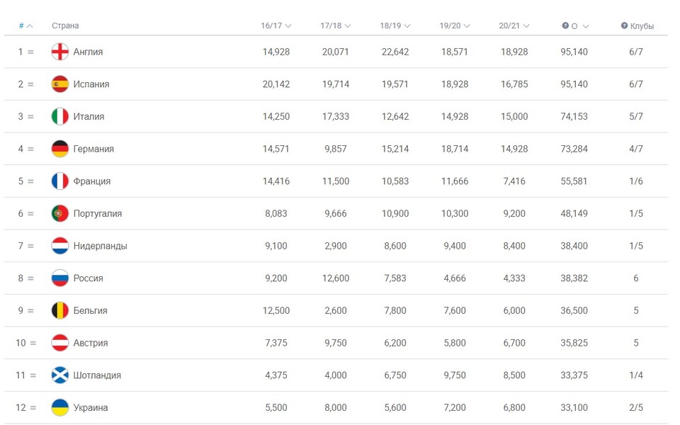 Україна так і не зуміла обігнати Шотландію, відставання від якої становить 0,275 бала. Якщо б вчора один із українських клубів переміг, то нам вдалося б посунути Шотландію з 11-ї позиції.