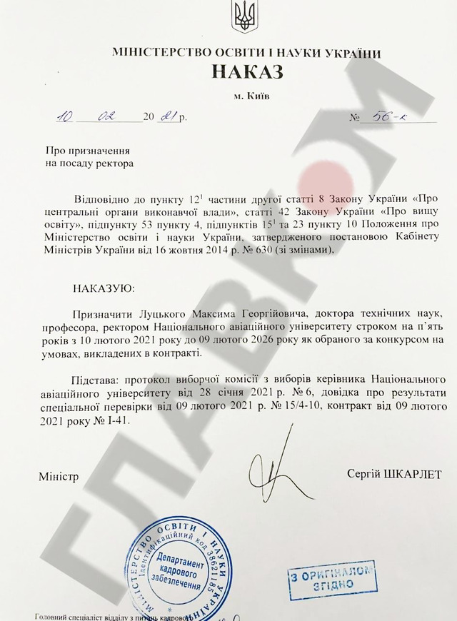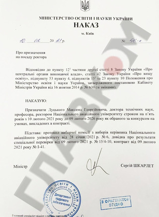 Міністр освіти Сергій Шкарлет підписав наказ про призначення кума одіозного міністра освіти Дмитра Табачника Максима Луцького ректором Національного авіаційного університету.