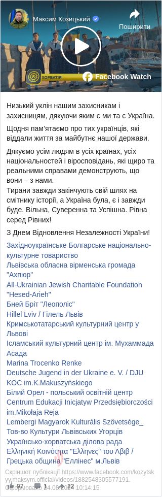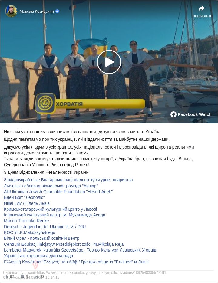 Начальник Львівської обласної військової адміністрації Максим Козицький привітав українців у День Незалежності.