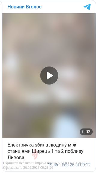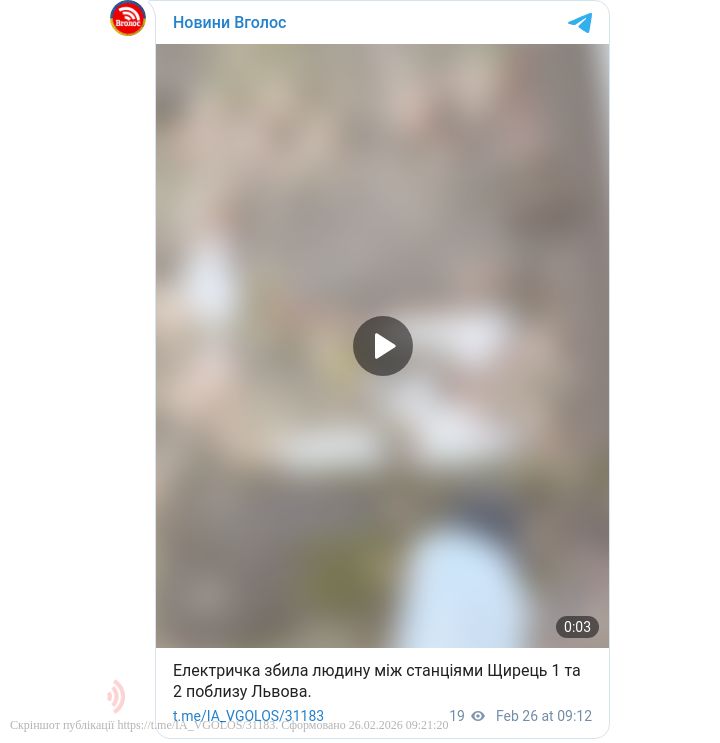 Сьогодні вранці, 26 лютого, на Львівщині сталася смертельна подія на залізничних коліях. Потяг, що курсував за маршрутом «Лавочне — Львів», збив літнього чоловіка між станціями Щирець 1 та Щирець 2.