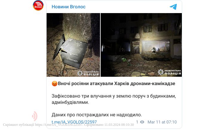 У Харкові внаслідок нічної повітряної атаки російських окупантів із застосуванням ударних дронів були зафіксовані три влучання на території Слобідського району міста.