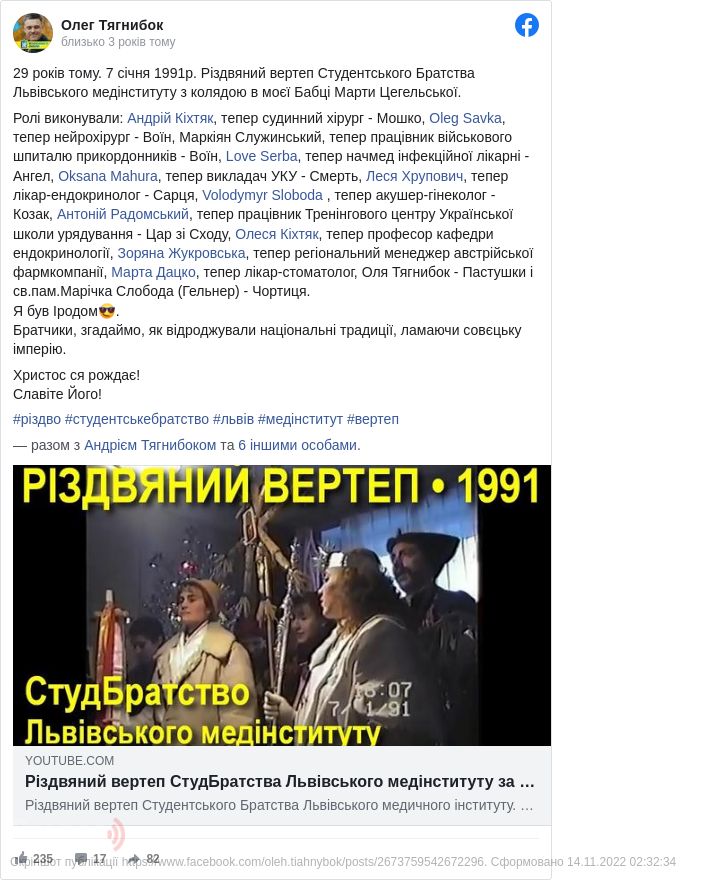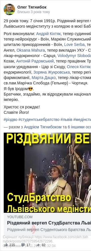 «29 років тому, 7 січня 1991р., Різдвяний вертеп Студентського Братства Львівського медінституту з колядою в моєї Бабці Марти Цегельської. Братчики, згадаймо, як відроджували національні традиції, ламаючи совєцьку імперію», - зазначив політик.