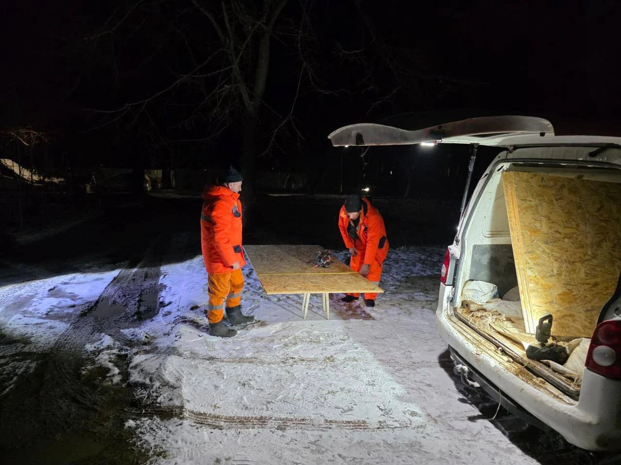 Комунальні служби працюють із ночі: закривають вибиті вікна плівкою та проводять прибирання територій.