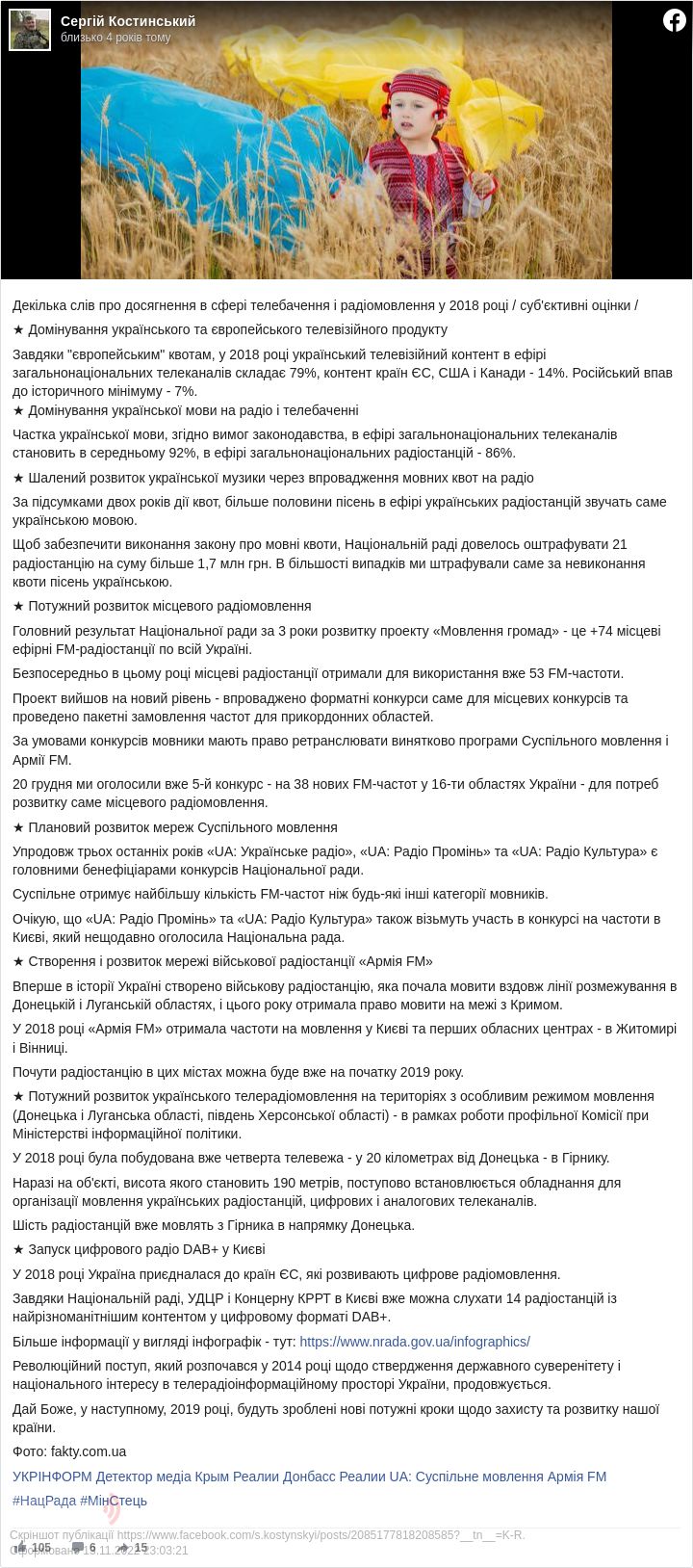 Так, перераховуючи досягнення у сфері телебачення і радіомовлення в 2018 році, він зазначив, що для того, щоб забезпечити виконання закону про мовні квоти, Національній раді довелося оштрафувати 21 радіостанцію на суму понад 1,7 млн грн.