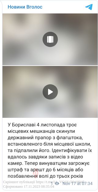 У Бориславі на Львівщині троє місцевих мешканців скинули державний прапор з флагштока, встановленого біля місцевої школи, та підпалили його.
