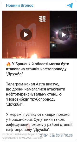 У Брянській області Росії вночі 30 січня була атакована розподільна станція нафтопроводу «Дружба». Там виникла пожежа.