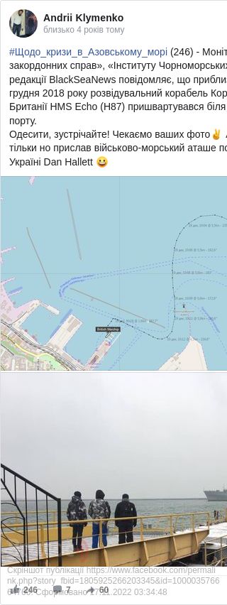 Сьогодні, 19 грудня, о 10.30 ранку корабель-розвідник НАТО HMS Echo (H87), який надіслала Великобританія, пришвартувався неподалік від причалу Одеського морського порту.