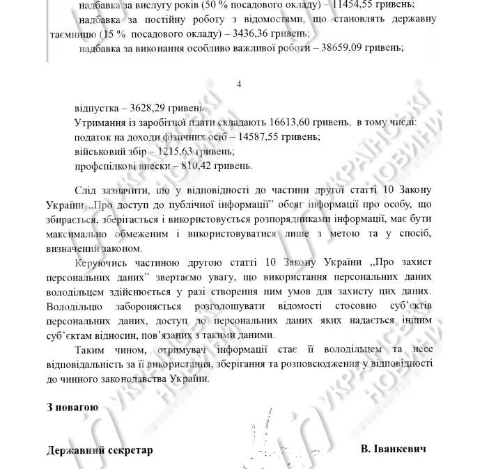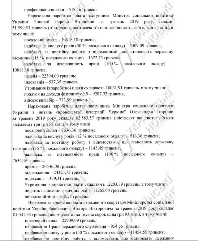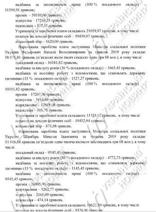 Зарплата першого заступника міністра Ольги Крентовської становила 108 тис. гривень, заступників Наталії Федорович - 58,1 тис. гривень, Миколи Шамбіра - 51,8 тис. гривень, Лариси Попової - 51,6 тис. гривень, зарплата заступника міністра соцполітики за євроінтеграції Олександри Чуркіної - 62,6 тис. гривень і держсекретаря Віктора Іванкевича - 81 тис. гривень.