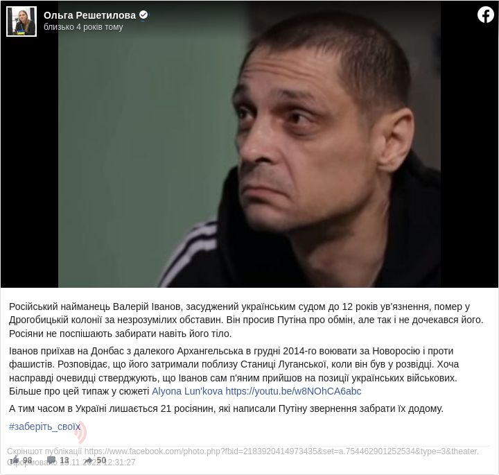 «Російський найманець Валерій Іванов, засуджений українським судом до 12 років ув'язнення, помер у Дрогобицькій колонії за незрозумілих обставин. Він просив Путіна про обмін, але так і не дочекався його. Росіяни не поспішають забирати навіть його тіло», – написала Решетилова.