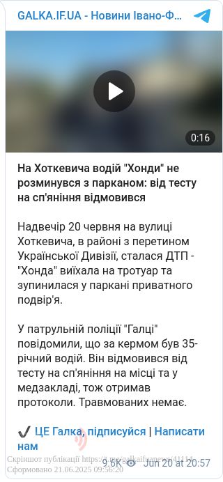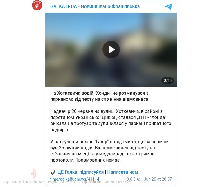 Надвечір 20 червня в Івано-Франківську на вулиці Хоткевича, в районі з перетином Української Дивізії, сталася ДТП – “Хонда” виїхала на тротуар та зупинилася у паркані приватного подвір’я.