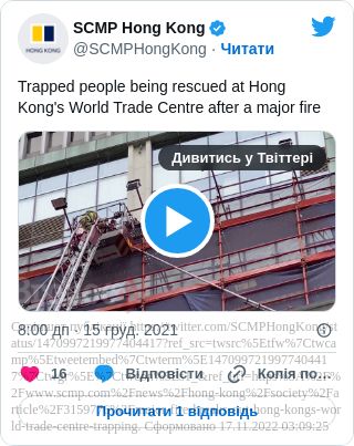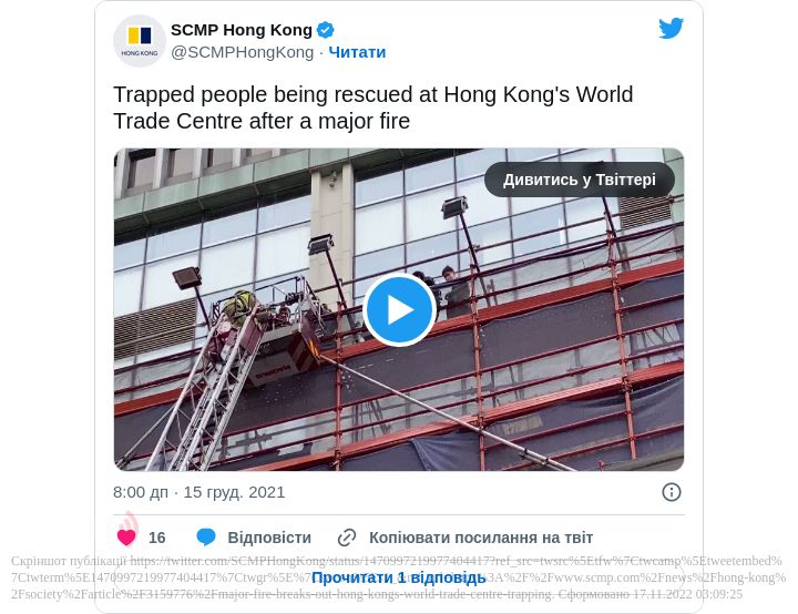 Відомо, що пожежа сталась у 38-поверховому Всесвітньому торговому центрі в районі Козуей-Бей. Так, повідомлення про займання у ТЦ надійшло сьогодні вранці за київським часом.