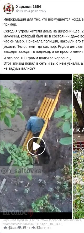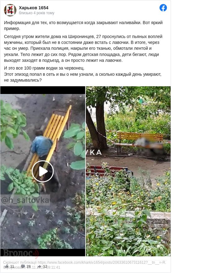 «Приїхала поліція, накрила його тканиною, обмотала стрічкою і поїхала. Тіло лежить досі. Поруч дитячий майданчик, діти бігають, люди виходять-заходять в під'їзд, а він просто лежить на лавці», - йдеться в повідомленні.