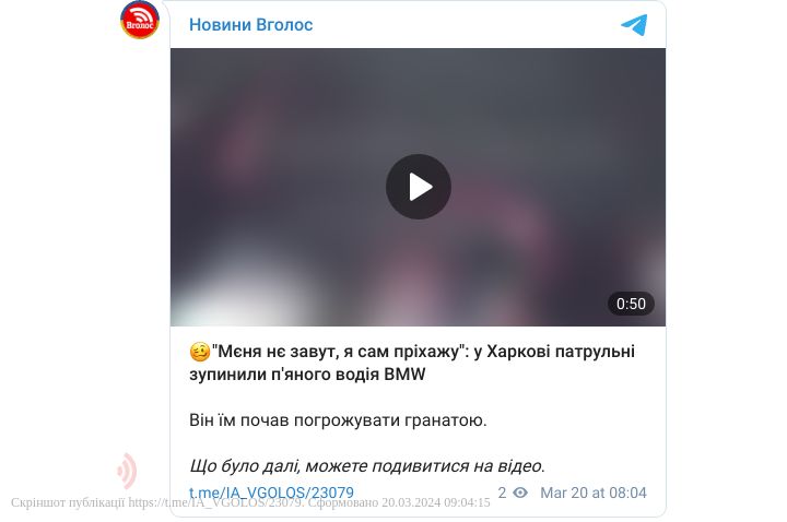 Харківські поліцейські під час патрулювання зупинили нетверезого водія, в якого в руці була граната.