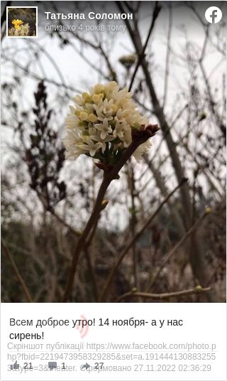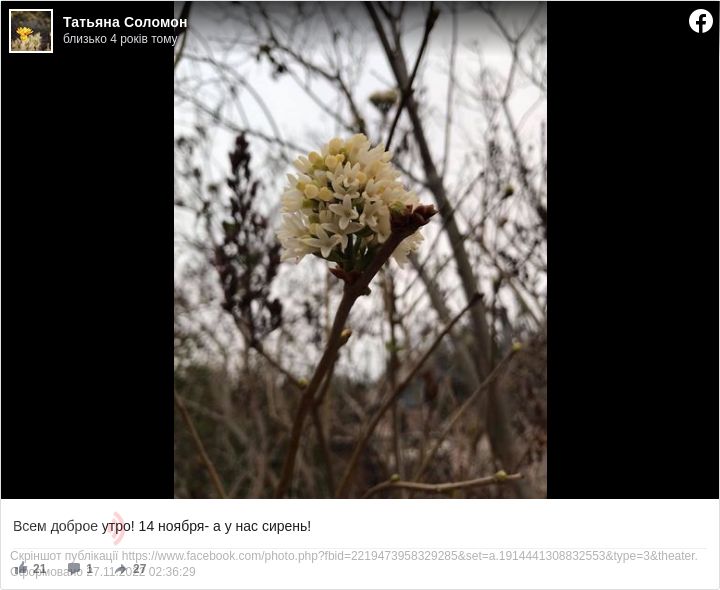 Тетяна Саломон поділилася з користувачами мережі квітучою гілкою білого бузку. На знімку видно, що самотня вкрита суцвіттям гілочка квітне на тлі дерев без листя. Пост жінка підписала словами "14 листопада - а у нас бузок!".