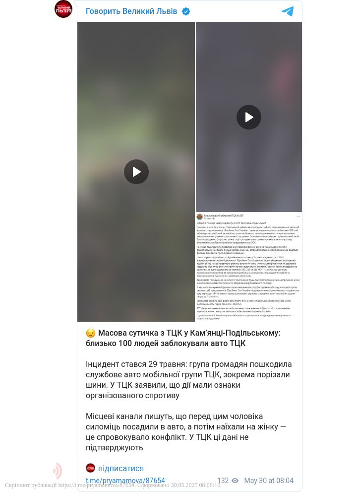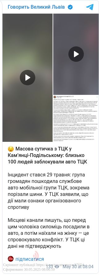 У четвер, 29 травня, в Кам’янці-Подільському (Хмельницька область) близько 100 людей заблокували та пошкодили службовий автомобіль Територіального центру комплектування та соціальної підтримки (ТЦК та СП).