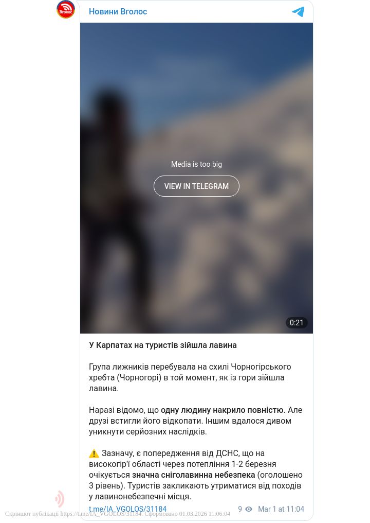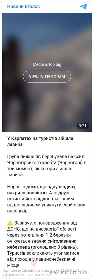 Зазначу, є попередження від ДСНС, що на високогір'ї області через потепління 1-2 березня очiкується значна сніголавинна небезпека (оголошено 3 рівень). Туристів закликають утриматися від походів у лавинонебезпечні місця.