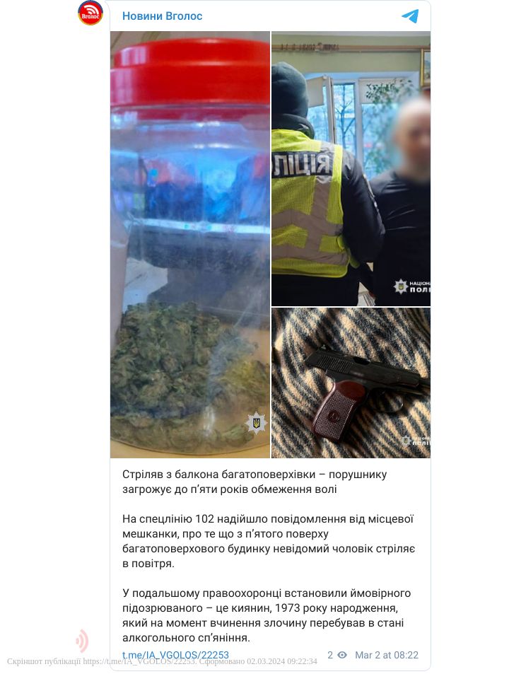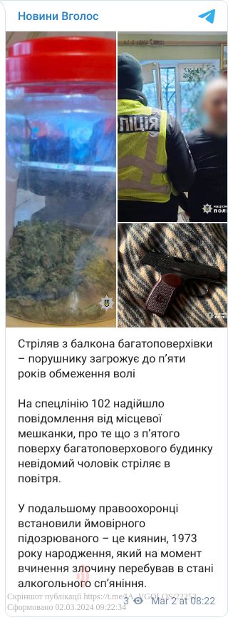 Як повідомляє поліція Києва, на спецлінію 102 надійшло повідомлення від місцевої мешканки, про те що з п’ятого поверху багатоповерхового будинку невідомий чоловік стріляє в повітря. На місце події негайно прибула слідчо-оперативна група Святошинського управління поліції та патрульні поліцейські.
