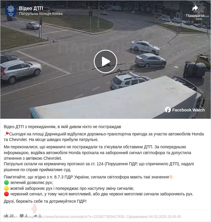 Сьогодні на площі Дарницькій у Києві сталася дорожньо-транспортна пригода за участю автомобілів Honda та Chevrolet, у результаті аварії остання автівка перекинулася.