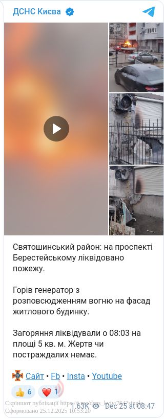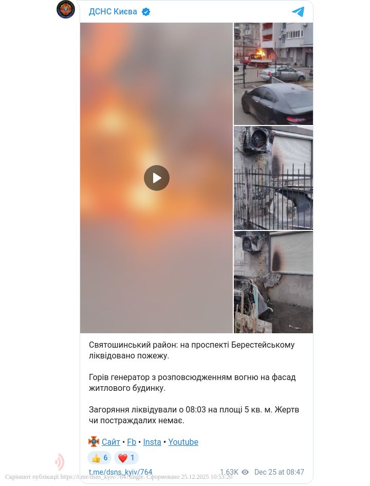 У Святошинському районі столиці виникла пожежа, спричинена роботою генератора. Вогонь перекинувся на фасад житлового будинку.