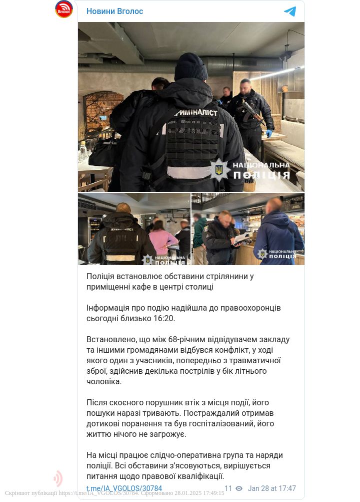Близько 16:20 у столичній поліції отримали повідомлення про стрілянину в кафе в центрі Києва.