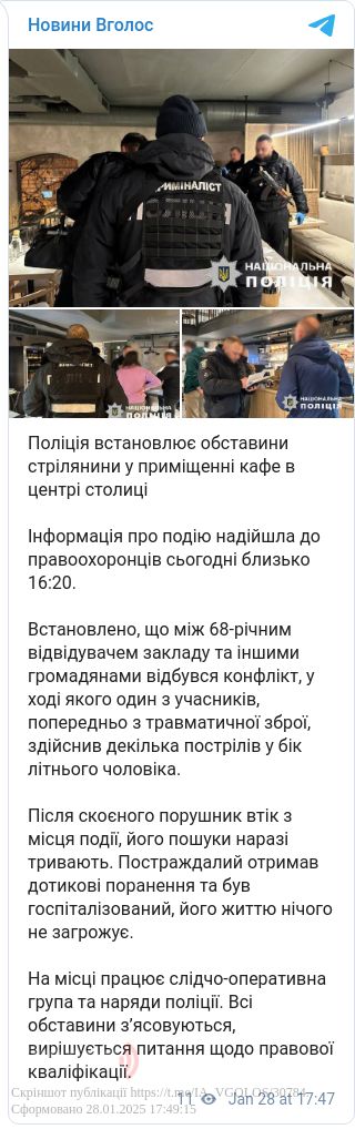 Попередньо встановлено, що між 68-річним відвідувачем та іншими клієнтами закладу виник конфлікт. У ході сварки один з учасників відкрив стрілянину, ймовірно, з травматичної зброї, поранивши літнього чоловіка.\