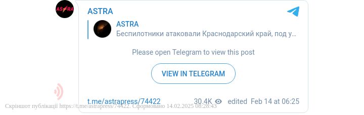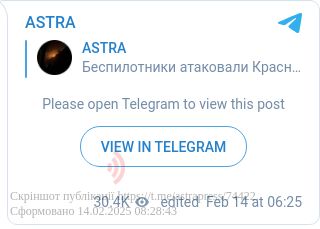 Ввечері 13 лютого пролунали вибухи у Слов'янську-на-Кубані в Краснодарському краї Росії. Місцеві ЗМІ повідомляють, що дрони, ймовірно, атакували місцевий нафтопереробний завод.