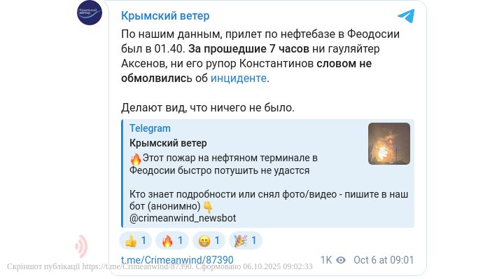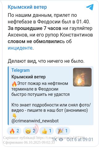 Пізніше у Telegram-каналі повідомили про влучання по нафтобазі та серію вибухів. Там зайнялася пожежа, заграву від якої було видно за 30 кілометрів. За даними каналу, внаслідок прильоту на Феодосійському нафтоналивному терміналі вибухнув резервуар із паливом.
