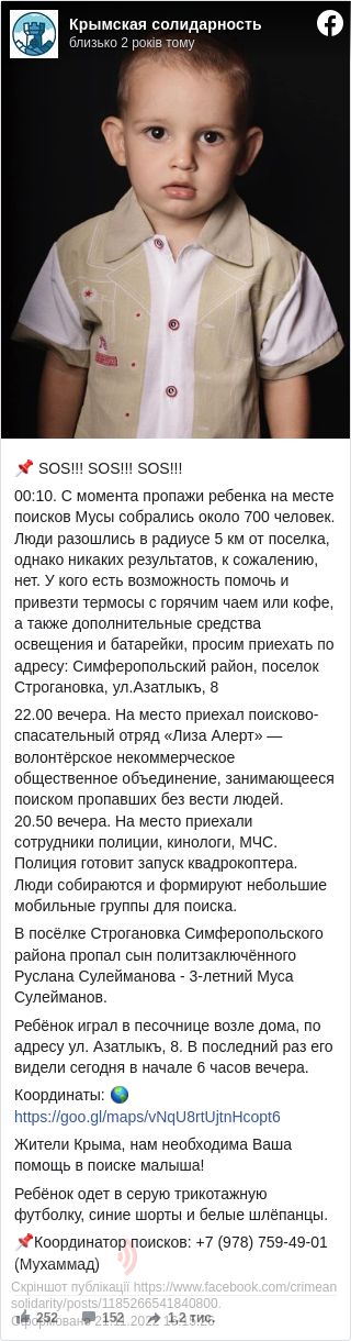 В селі Строганівка Сімферопольського району в Криму зник син політв'язня Руслана Сулейманова - 3-річний Муса Сулейманов.